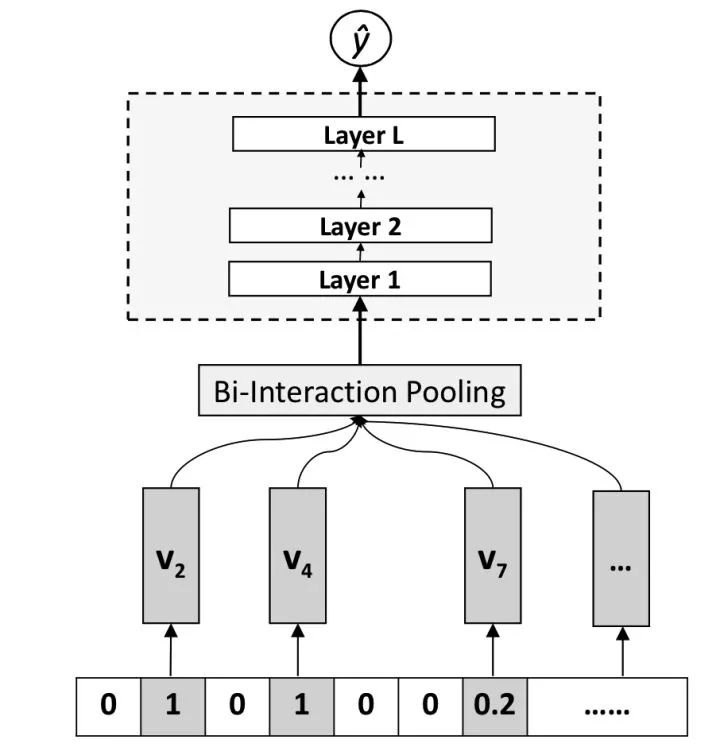 图 1 是从神经网络的角度表示 FM, 可以看成底层为特征维度为 n 的离散输入,经过 embedding 层后,对 embedding 层线性部分(LR)和非线性部分(特征交叉部分)累加后输出。
