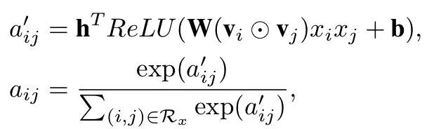 从这个角度来看,其实 AFM 就是个加权累加的过程。Attention Net 部分的权重 aij 不是直接学习,而是通过如下公式表示: