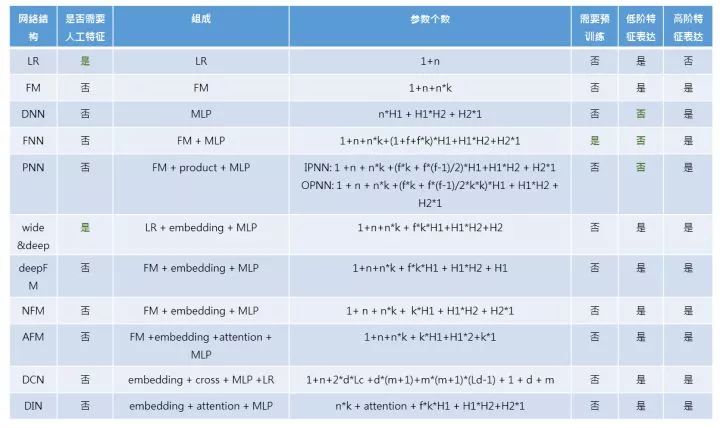LR 模型采用原始人工交叉特征,FM 自动学习 xi 和 xj 的二阶交叉特征,而 PNN 用 product 方式做二阶交叉,NFM 和 AFM 也都采用了 Bi-interaction 的方式学习特征的二阶交叉。对于更高阶的特征交叉,只有让 Deep 去学习了。