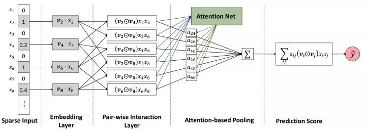 和 NFM 直接把这些交叉项 sum 起来不同,AFM 引入了一个 Attention Net,认为这些交叉特征项每个对结果的贡献是不同的,例如 xi 和 xj 的权重重要度,用 aij 来表示。