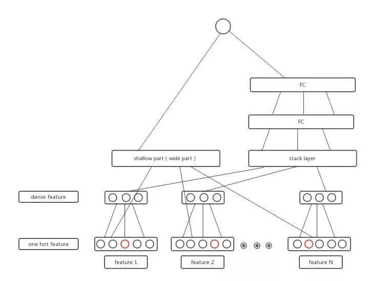 在 Embedding and Stacking Layer 之后,网络分成了两路,一路是传统的 DNN 结构。表示如下: