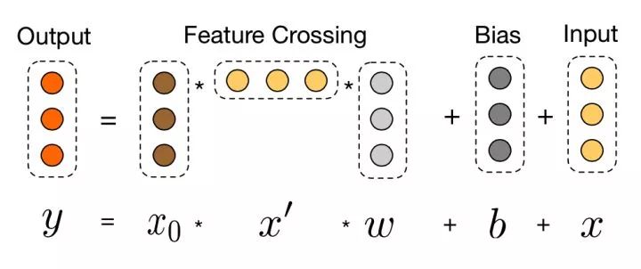 当然,这部分也可以用前面讲到的 FM 来做 embedding。为了和原始论文保持一致,这里我们假设 X0 向量维度为 d(上文的网络结构中为 k),这一层的做法就是简单地把各种 embedding 向量 concat 起来。