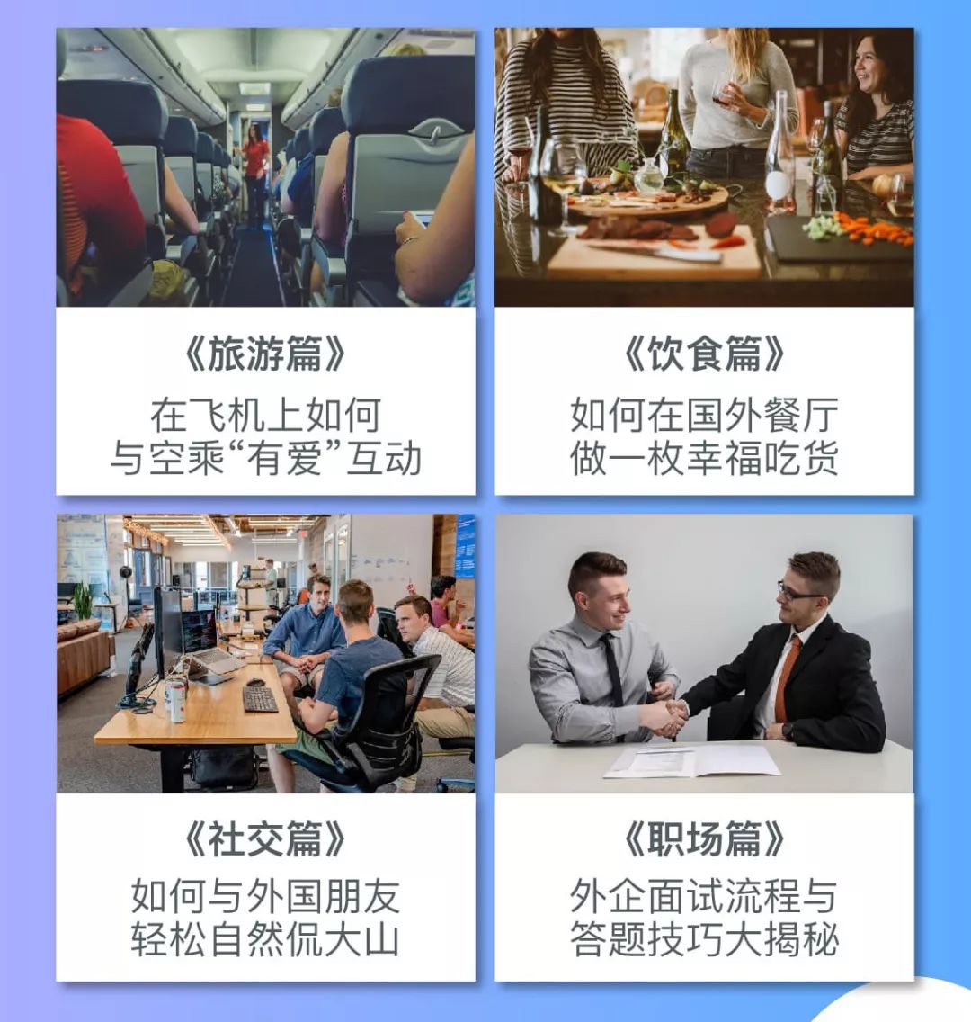 在4天的直播里,我将教你”U+1“万能句型法,让你扔掉各种传统教材,仅通过对若干核心句型的场景扩展、替换内容和表达应用,就能匹配很多真实情景。例如接送机、过安检海关、逛街还价、餐厅点餐、自我介绍等……