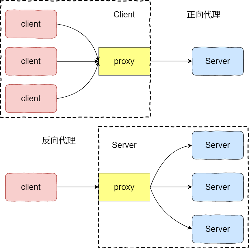 代理作为中间位置,相对请求方为服务端,相当于后端服务端为请求方。代理常见的功能为负载均衡。在负载均衡中需要区分正向代理与反向代理,其中也就会涉及调度算法,比如轮询,一致性哈希等。