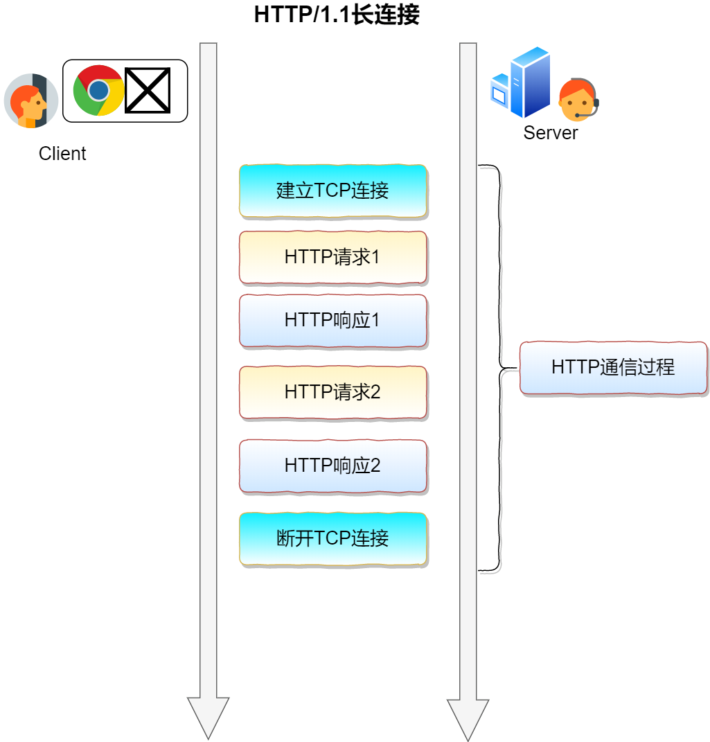 随着文件越来越大,图片等信息越来越复杂,如果每一次上传下载文件都需要建立连接断开连接的过程将增加大量的开销。为此,提出了持久连接,也就是一次TCP连接可以具有多个HTTP请求。当然持久连接是可选择的,如果考虑关闭,只需要使用Connecttion:close关闭即可。长连接如下图所示: