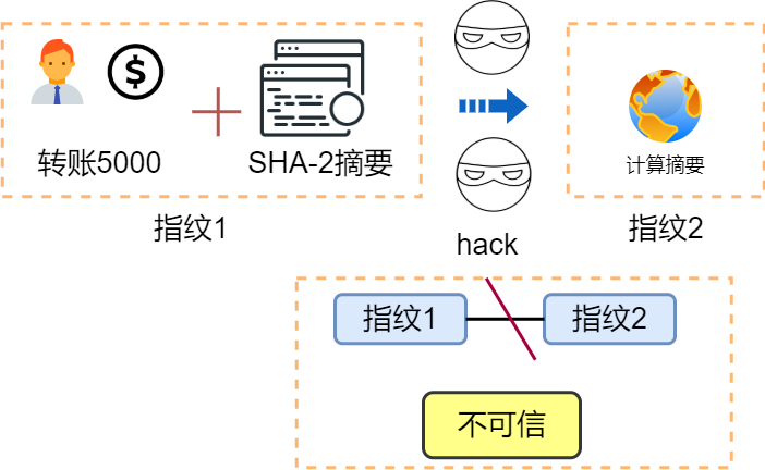假设小A转账5000给小C,小A加上SHA-2摘要。网站计算摘要并对比,如果一致则完整可信。
