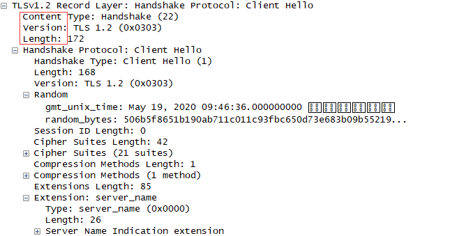 根据Wireshak结果,对TLS进一步剖析。TCP三次握手建立连接,作为礼貌,Client先打招呼"Client Hello"。里面包含了Client的版本号、所支持的密码套件和随机数,如下图所示: