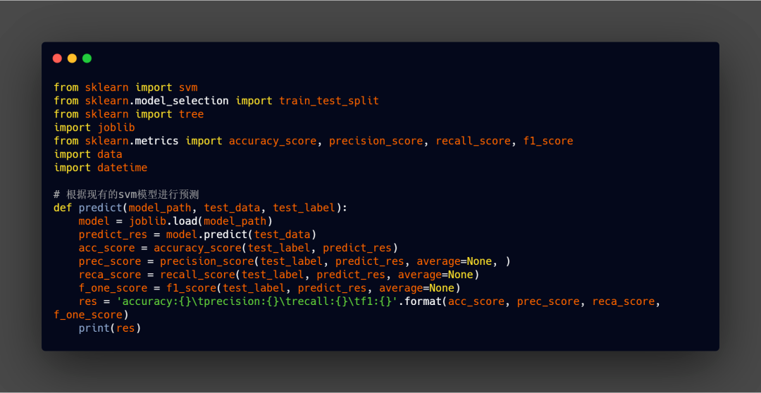 使用开源Skearn库进行模型训练并识别预测,此处假设使用SVM(仅使用默认参数)