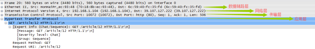 注意头部中的协议字段,如果此字段值为0x0600则为TCP分组。当知道了是TCP分组后,是不是可以通过TCP头部中端口(80)就可以判断为HTTP呢,不能的,很多情况都会使用动态端口的方式进行部署。此时可以通过HTTP中的关键字进行判断。如果为HTTP,再通过头部字段中的"Content-type",Charset等确认文本信息,编码方式,最后采用解码算法进行还原。