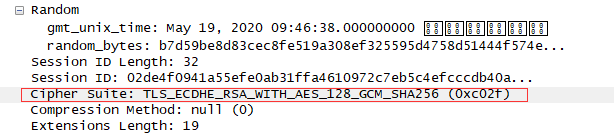 Server端表示尊重,回复"ServerHello",同时进行版本校对,给出随机数(Server Random),从Client算法列表中选择一个密码套件,在这里选择的"TLS_ECDHE_RSA_WITH_AES_128_GCM_SHA256"。