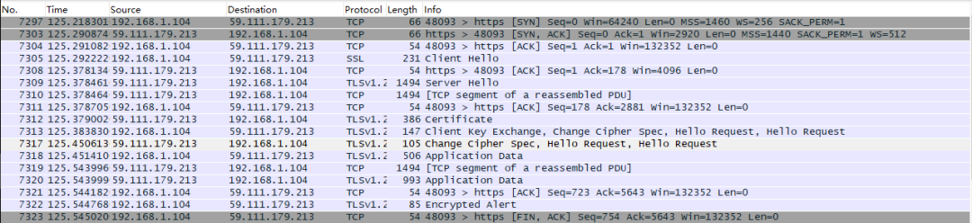 从上图我们知道HTTPS无非是在传输层和应用层中间加了一层TLS,正是TLS紧跟当代密码学的步伐,尽全力的保障用户的安全。老规矩,我们用wireshark看看长什么样子。