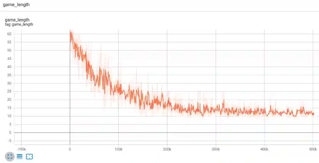 这就是训练循环。如下图所示,我们可以在 TensorBoard 中观察训练进度;其中,我们使代理指标“game_length”(完成游戏所需的步骤数)来跟踪进度:若 agent 变得更聪明,它便能以更少的步骤完成游戏。