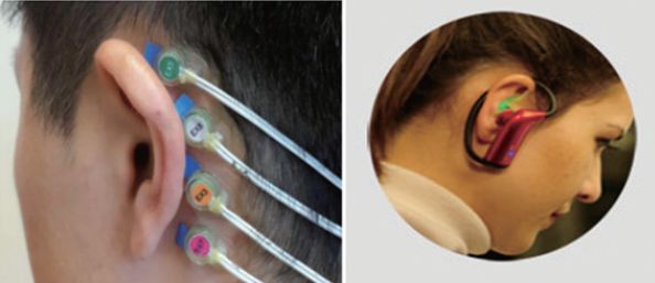 信号采集是制约脑机接口从实验室走向现实生活应用的重要因素。对基于头皮脑电的无创脑机接口而言,湿电极方案的脑机接口系统需要花费较长时间准备导电膏,使用后需要清洗头发;而以往的干电极系统主要采集前额区域脑电信号,所得解码的大脑状态少且准确率低,实际使用场景有限。美国加州大学圣迭戈分校的研究团队在《IEEE Transactions on Neural Systems and Rehabilitation Engineering》报道了一种将电极放置在耳后无毛发覆盖区域的稳态视觉诱发电位脑机接口系统,并在一个12分类任务中,达到了85%左右的分类正确率,信息传输率达到30 bit/min左右(图4(a))。这一研究进展对于普通健康人群在日常生活情境中便捷采集脑电并高效使用脑机接口提供了可行性支撑。相应的,基于耳后电极的脑机接口商业硬件现在开始出现(图4(b)),有望推动相关应用快速走向市场。