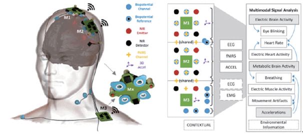 脑机接口实用化系统的构建对脑神经信号采集与处理设备的小型化、无线化提出了高要求。虽然目前已有不少基于脑电的小型化设备推出,但是能同时采集多种神经生理信号的小型化硬件还不多见。2017年6月,德国柏林工业大学的脑机接口研究团队发布了一款可同时采集脑电、功能近红外脑功能像,以及其他常规生理参数(如心电、肌电和加速度等)的无线模块化硬件架构(M3BA:a mobile,modular,multimodal biosignal acquisition architecture),其中每个M3BA模块(不含电池)的边长仅为42 mm(图3)。这是首个同时兼备了模块化、可移动化、小型化、多模态和可扩展性的多生理参数采集架构,对实现脑机接口技术走向实际应用具有积极意义。