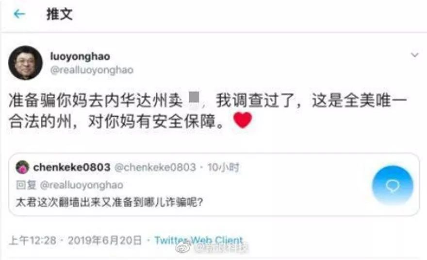 随后不久,就有人发现罗永浩在推特怒怼网友,并爆出带有辱骂性的言论,显然罗永浩急了。激怒罗永浩的是用户chenkeke0803的留言:“太君这次翻墙出来又准备到哪儿诈骗呢?”