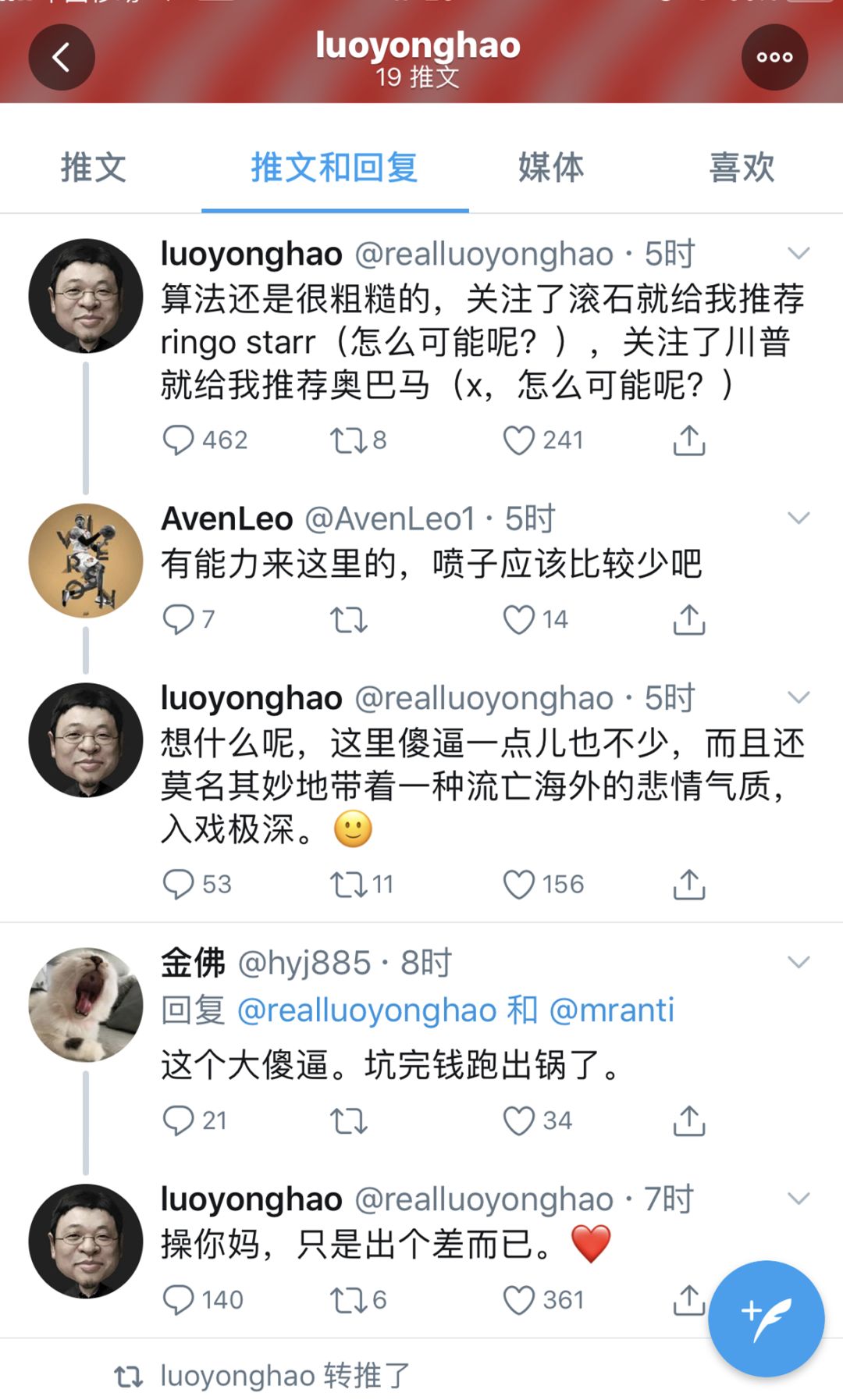昨日,罗永浩发微博称,为了即将开通的海外业务,他提前开通了一个推特账号,并调侃道:“这上面能拉黑多少人?”