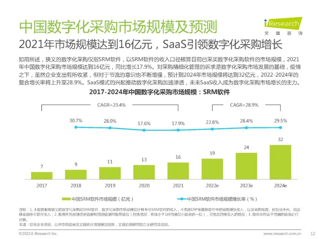 以SRM软件的收入口径核算目前已采买数字化采购软件的市场规模,2021年中国数字化采购市场规模达到16亿元,同比增长17.9%。考虑企业节流意识的不断增强,预计到2024年市场规模将达到32亿元,其中SaaS收入将成为市场增长的主要动力。