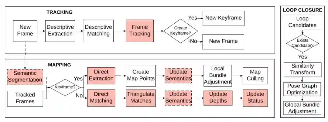 我们提出了一种语义单目SLAM框架,旨在处理高度动态的环境,结合基于特征的方法和直接方法,以在具有挑战性的条件下实现稳健性。所提出的方法利用在显式概率模型内从场景提取的语义信息,这最大化了跟踪和建图两者依赖于相对于相机不呈现相对运动的那些场景部分的概率。