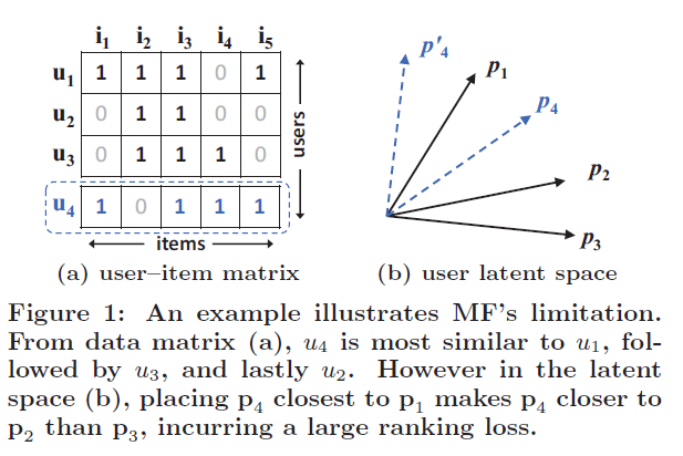 (c) 忽略了神经网络做交互函数时过拟合的问题。在论文投出去后,我也一直纳闷为什么MLP理论上有很强的表示能力,但实际性能缺不如MF?做了许多实验分析,发现MLP可以获得比MF低很多的training loss,但没有转化成测试集上的强泛化,反应了神经网络做交互函数时overfitting的问题,但当时用keras实现NCF时并没有考虑到加正则或dropout。