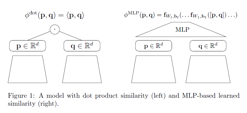 直觉上,将矩阵分解模型里的点积替换为MLP应该至少不会得到更差的效果。因为点积操作在带来归纳偏置的同时也限制了模型的表达能力,拥有更强表达能力并在理论上能拟合任意函数的MLP应该是更好的。但这只是最理想的情况。如果考虑到实际场景中可用的数据,这种直觉就未必正确,这也是Rendle这篇文章里试图通过实验论证的一个点。
