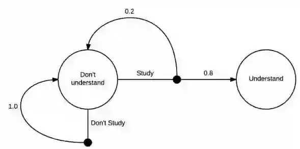 这个MDP展示了学习马尔科夫决策的过程。在最开始你在一个“不理解”的状态中,接下来,你有两个可能的动作,学习或者不学习。如果你选择不学习,则有100%的可能性返回到不理解的状态里。但是,如果你选择学习,只有20%的可能性让你回到最开始的地方,即80%的可能性变成理解的状态。