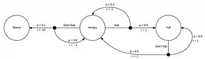 由于这个MDP是十分简单的,我们很容易发现待在一个更高奖励的区域的方式,即当我们饥饿的时候就吃。在这个模型中,当我们处于吃饱状态的时候没有太多其它的选择,但是我们将会不可避免的再次饥饿,然后立马选择进食。强化学习感兴趣的问题其实具有更大更复杂的马尔科夫决策过程,并且在我们开始实际探索前,我们通常不知道这些策略。