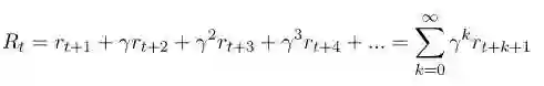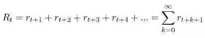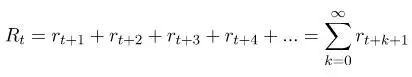 正如前面所说的,强化学习中的智能体学习如何最大化未来的累积奖励。这个用来描述未来的累积奖励的词称为回报,通常用R表示。我们还使用下标t来表示在某个时间步骤下的返回值。数学公式的表示如下:
