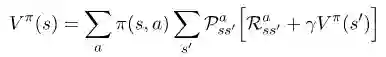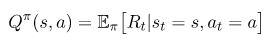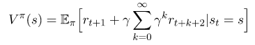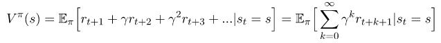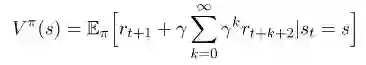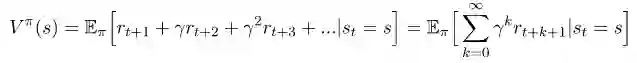 状态价值函数描述了在执行一个策略时的状态值。这是一个从状态s开始执行我们的策略Π所得到的预期回报: