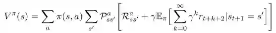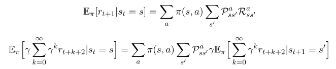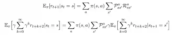 在这里期望可以被描述如果我们采取策略Π时,继续从状态s出发的期望回报。可以通过对所有可能的动作和所有可能的返回状态的求和来描述期望。接下来的两个方程可以帮助我们迈出下一步。