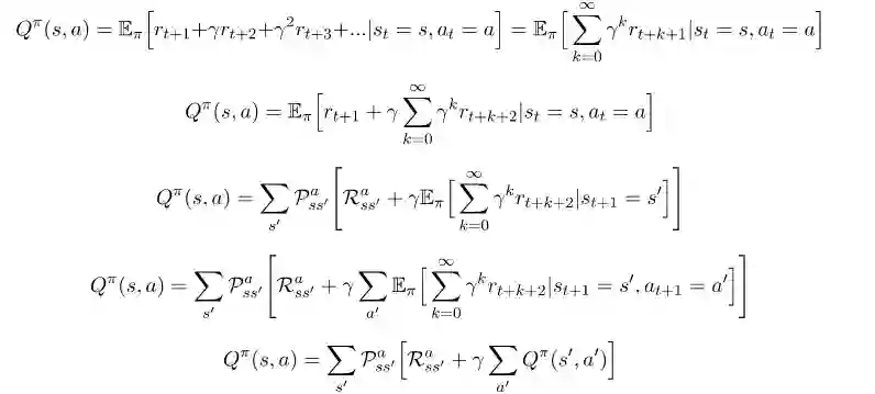 Bellman方程(贝尔曼方程)的动作价值函数可以以类似的方式推导出来。感兴趣的人可以在文章的最后看到具体的步骤。其最终结果如下: