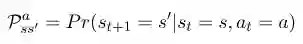 P是过渡概率。如果我们在状态s处开始,采取行动a,那么我们在状态s’的概率为