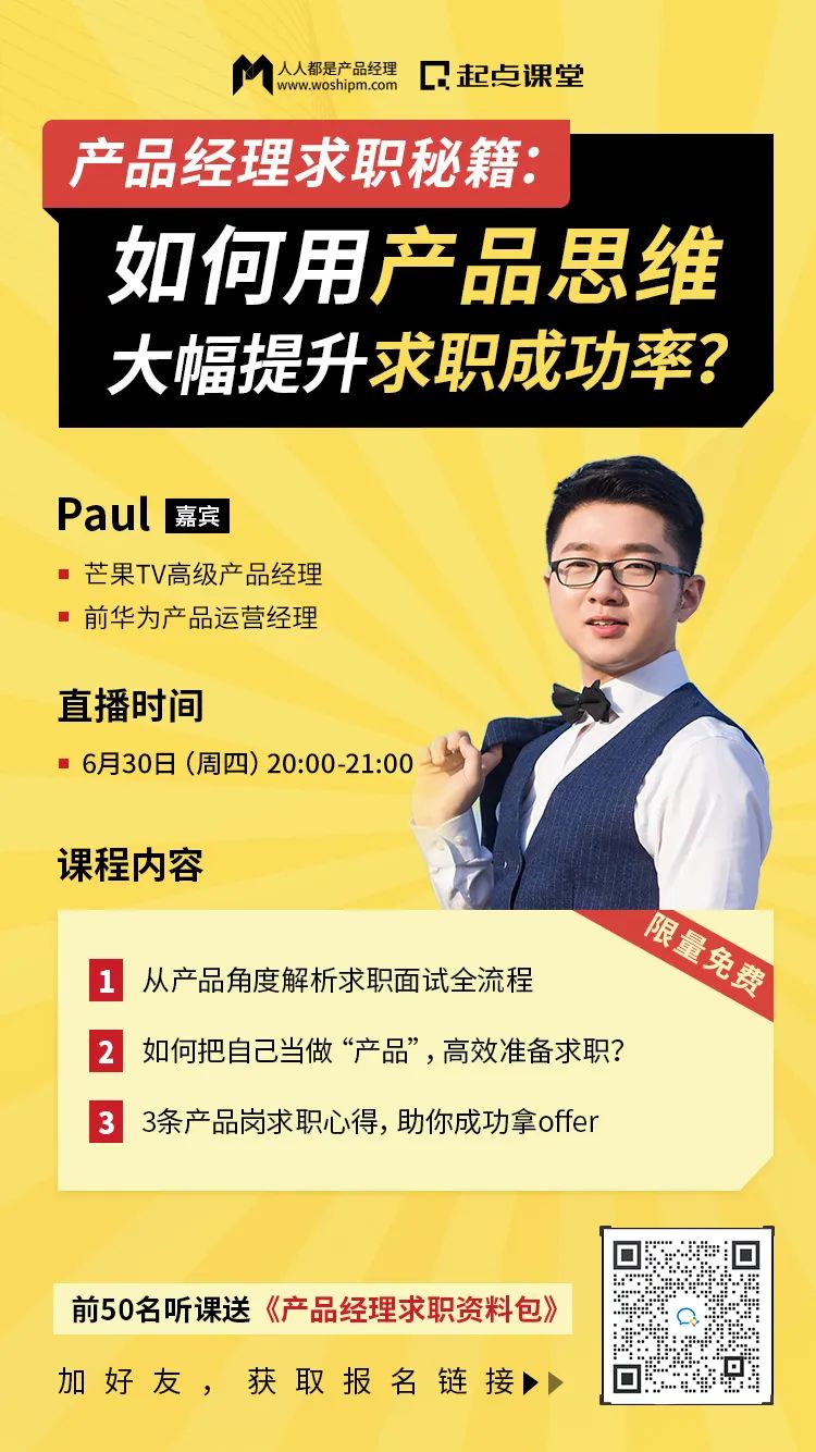 为了让各位朋友们少走弯路、最大化提速自己的成长和求职进度,今晚8点,【人人都是产品经理】联合【起点课堂】特邀芒果TV高级产品经理、前华为产品运营经理@Paul,做客“起点课堂产品经理入门公开课”,针对以上这些问题,直播分享【产品经理求职秘籍:如何用产品思维大幅提升求职成功率?】,手把手带你了解如何活学活用产品思维!