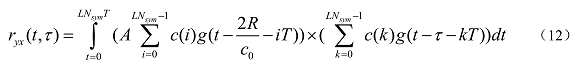 在对公式进行简化之后,当 τ = 2R/c_0 - (k-i)T 时,可得到相关峰值。此时,k = i + 2R/(c_0*T),进而知道了目标的距离、使用的扩频码,可以进一步解调出数据,并得到目标速度(从码相位推出)。