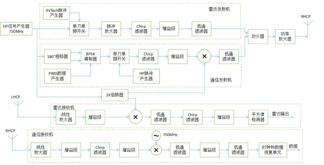 文献 [5] 中,作者使用了 Up-Chirp 信号(雷达)和 Down-Chirp 信号(通信)(它们基本正交),Chirp 信号的调频率为 1 GHz/μs,载波频率为 750 MHz,系统带宽为 500 MHz,脉冲时间为 0.5 μs(频率从最低到最高所需要的时间),处理增益(时宽带宽积)为 24 dB;数据调制方式是二进制相移键控(BPSK),射频频率为 75 MHz,发射功率为 27 dBm。
