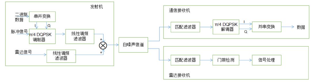 文献 [4] 中,作者使用了 Up-Chirp 信号(雷达)和 Down-Chirp 信号(通信)(它们基本正交),Chirp 信号的调频率为 40 MHz/μs,系统带宽为 80 MHz,脉冲时间为 2 μs(频率从最低到最高所需要的时间),处理增益(时宽带宽积)为 22 dB,数据调制方式是π/4-DQPSK;射频频率为 10 GHz。