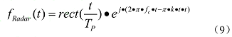 文献[4]中,作者使用了 Up-Chirp 信号(雷达)和 Down-Chirp 信号(通信)(它们基本正交),Chirp 信号的调频率为 40 MHz/μs,系统带宽为 80 MHz,脉冲时间为 2 μs(频率从最低到最高所需要的时间),处理增益(时宽带宽积)为 22 dB,数据调制方式是π/4-DQPSK;射频频率为 10 GHz。