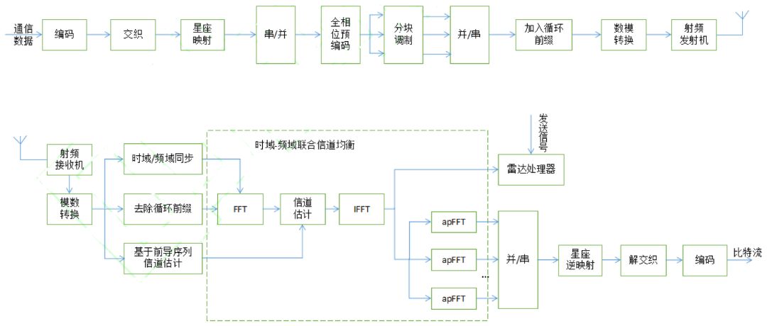 基于分数阶傅里叶变换(FRFT)方案的示意图如图 3 所示 [11]。雷达信号和通信信号是同一个,通信数据调制在不同的初始频率的 Chirp 信号上,接收端使用分数阶傅里叶变换分别把通信数据和雷达信号提取出来。