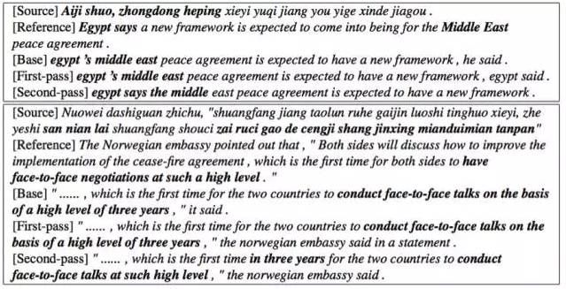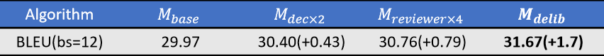(1)神经机器翻译(NMT),即用神经网络来将源语言的句子翻译到目标语言。标准的 NMT 模型由一个编码器(用于编码源句子)和一个解码器(用于生成目标句子)组成,因为可以使用我们提出的推敲网络加以改善。在WMT' 14 英语→法语数据集上基于广泛应用的单层GRU模型上实验结果表明:相比于没有使用推敲的模型,使用推敲可以将BLEU分值提升 1.7。我们还在汉语→英语翻译上应用了我们的模型,并且在 4 种不同的测试集上平均实现了 1.26 的BLEU提升。此外,在 WMT' 14 英语→法语翻译任务上,通过将推敲应用于深度LSTM模型,我们实现了 41.50 的BLEU分值,这个成绩是这一任务的全新纪录。