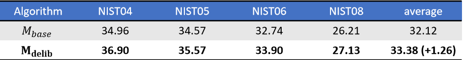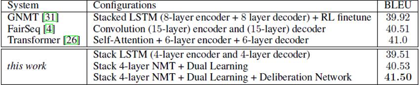 表 4:推敲网络与不同的深度 NMT 系统(英语→法语)之间的比较