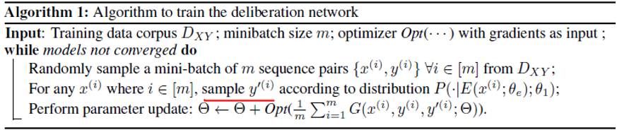 其中T_yˆ 是 yˆ 的长度。之后,推敲解码器D2 以 x、yˆ 和 sˆ 为输入,输出经过精细处理后的序列 y。当D2 生成第t个词 y_t 时,还有一个额外的注意模型被用于给每个yˆ_j 和 sˆ_j分配一个自适应权重β_j,其中 j ∈ [T_yˆ];而且 被馈送给D2。通过这种方式,目标序列的全局信息可以被用于生成过程中的精细处理。因为在优化推敲网络的过程中yˆ 的离散性会带来困难,所以我们提出了一种基于蒙特卡洛的算法来克服这种困难。