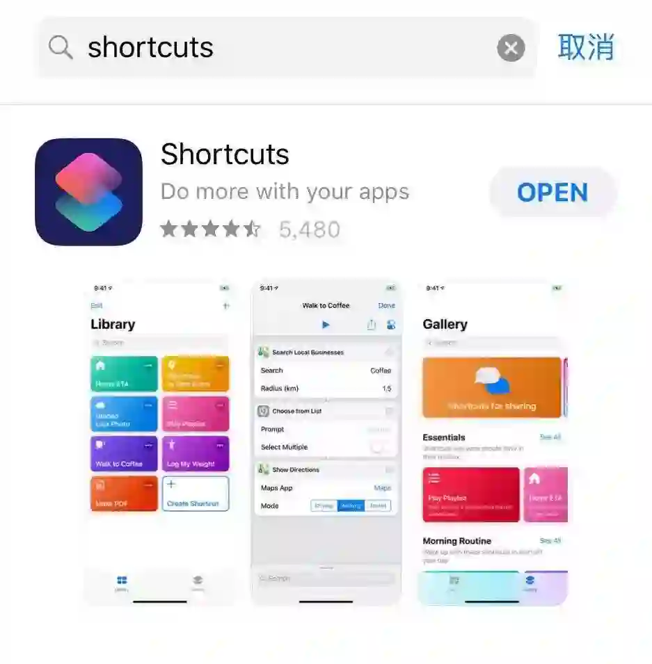 首先,捷径不是 iPhone 预设的功能,你需要在 App Store 里搜索“Shortcuts”或“捷径”,点击下载。