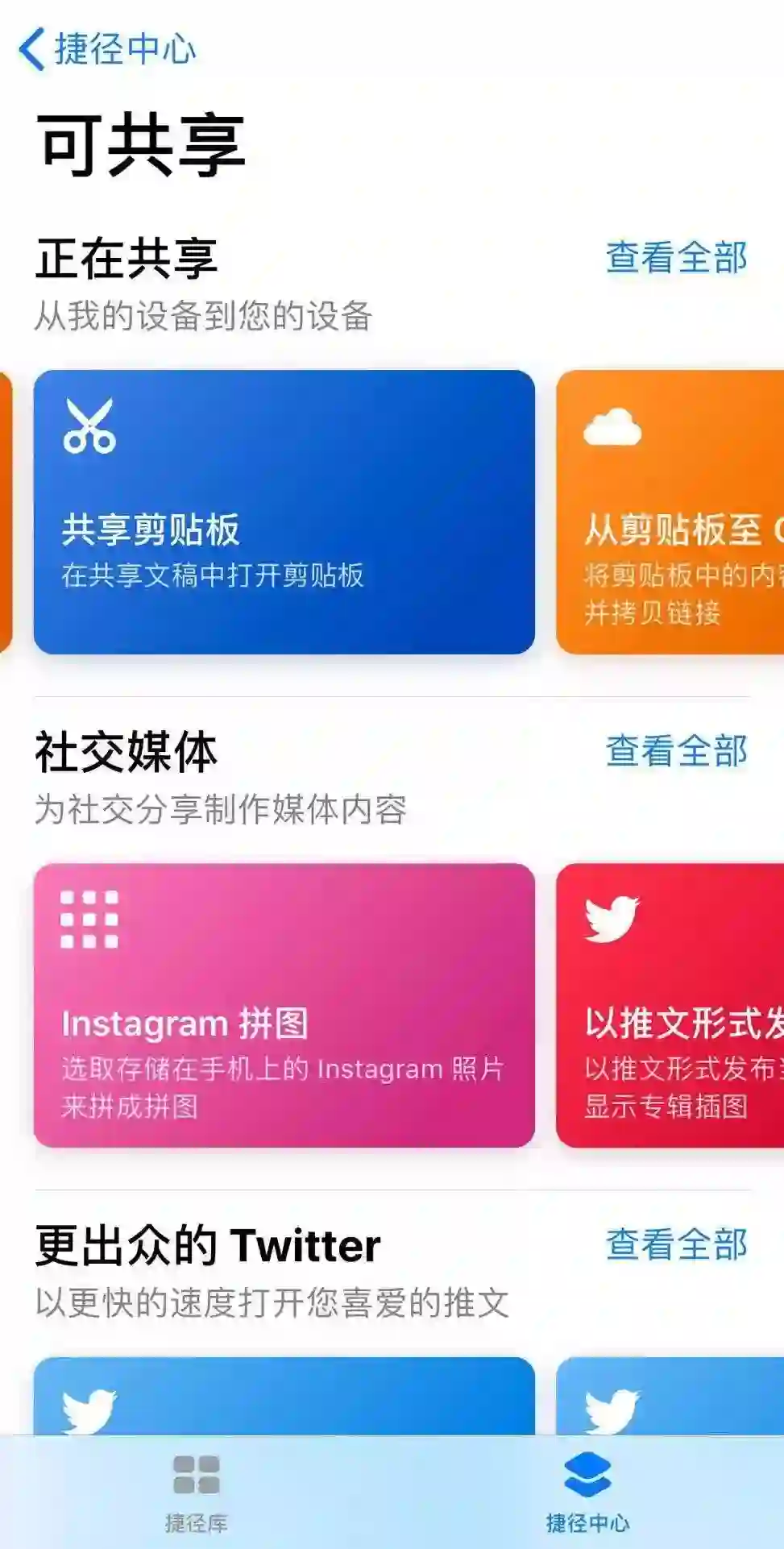 从这张捷径中心截图上我们可以看到,里面有“共享剪切板”、“选取手机相册里从 Instagram 上保存的照片并自动拼图”,以及“自动生成用户正在听的歌的歌词,发送推文,并且配上专辑封面图”。