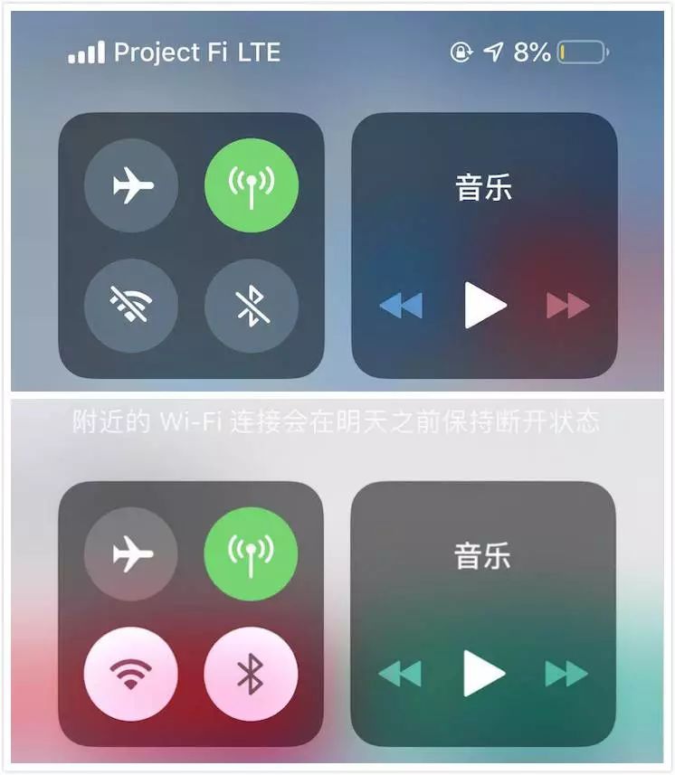 虽然在 iPhone 屏幕下划可以召唤快捷方式,快速关闭蓝牙和 Wi-Fi,但其实,在这里不能彻底关闭蓝牙和 Wi-Fi。它们虽然不再工作,却仍在后台耗费电量。