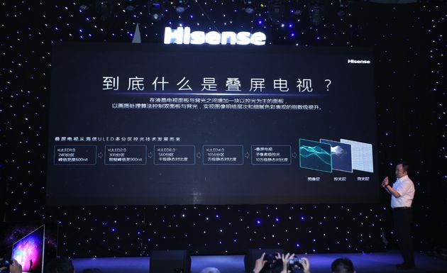7 月 14 日,海信发布全球首台叠屏电视 U9。海信首席科学家刘卫东表示,该电视使用了两层面板的叠屏技术,首次实现了背光层、控光层、图像层的协同控制,这是中国企业首创。
