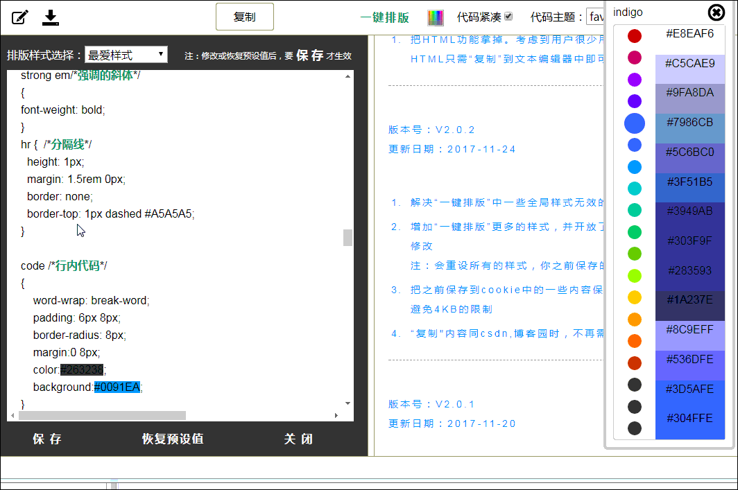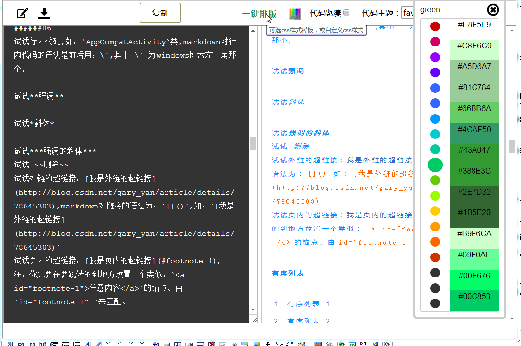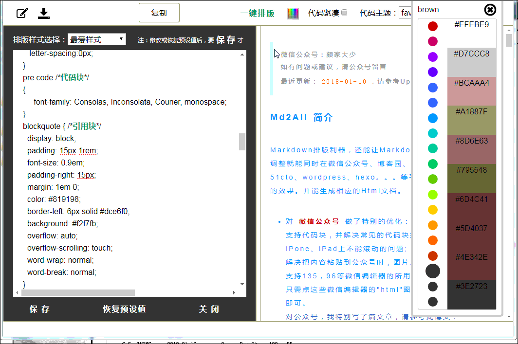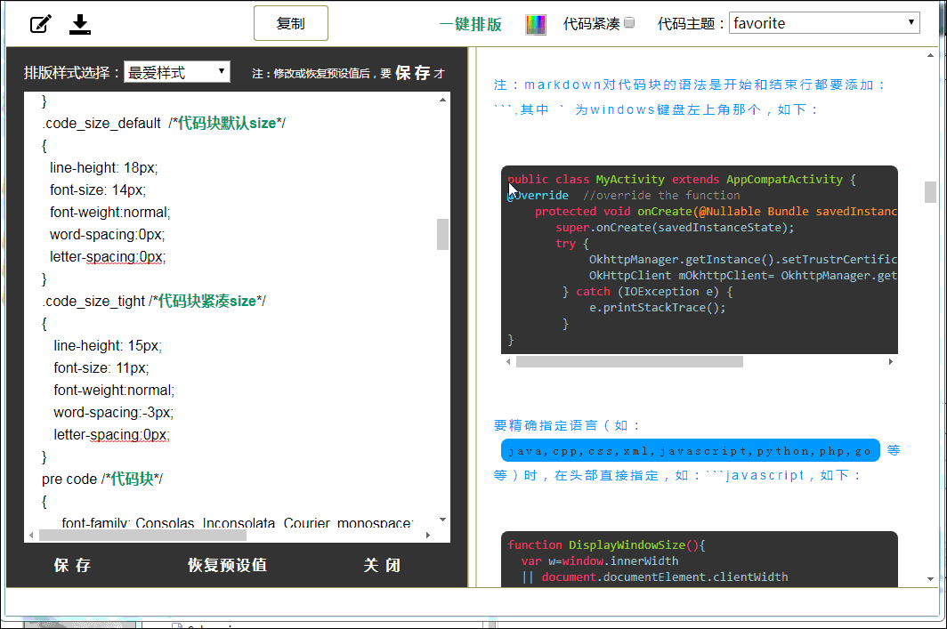 Markdown排版利器,支持 "一键排版" 的样式模板选择,支持"css样式自定义",支持80多种代码高亮。