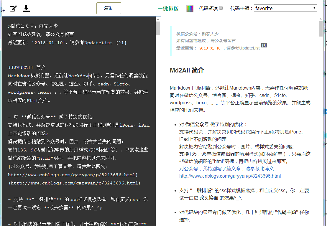 因本人也写博客,我通常的做法是先在博客平台(如CSDN,简书)把markdown写好,上传好图片(上传图片时,markdown会自动包含了图片的链接),然后再把博客平台的整个markdown内容复制到Md2All排版,再一键 “复制” ,粘贴,粘贴……到各个平台。