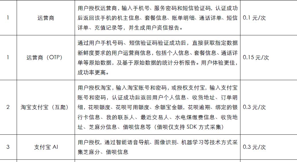 《IT时报》记者联系到魔蝎科技的产品经理余天(化名),他提供的一张产品报价表上显示,魔蝎科技有近50余项其可以提供的数据,其中包括运营商、支付宝、京东、滴滴、网银账单、寿险保单等各种不同类型的数据,“有的数据需要用户授权,比如运营商数据,包含机主信息、套餐信息、账单明细、通话详单、短信详单、充值记录等;淘宝支付宝数据则包括个人信息、收货地址、订单明细、花呗额度、余额宝金额等。”