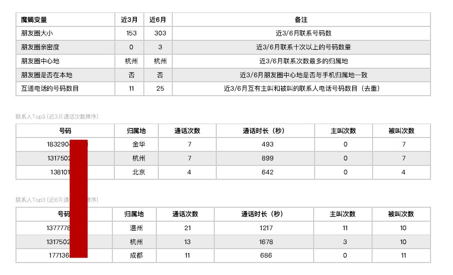 在余天提供的一份运营商报告案例中,《IT时报》记者看到机主详细的通话记录都呈现其中,甚至还有对通话的标识,比如外卖电话、归属地、每个时间段的通话次数等。