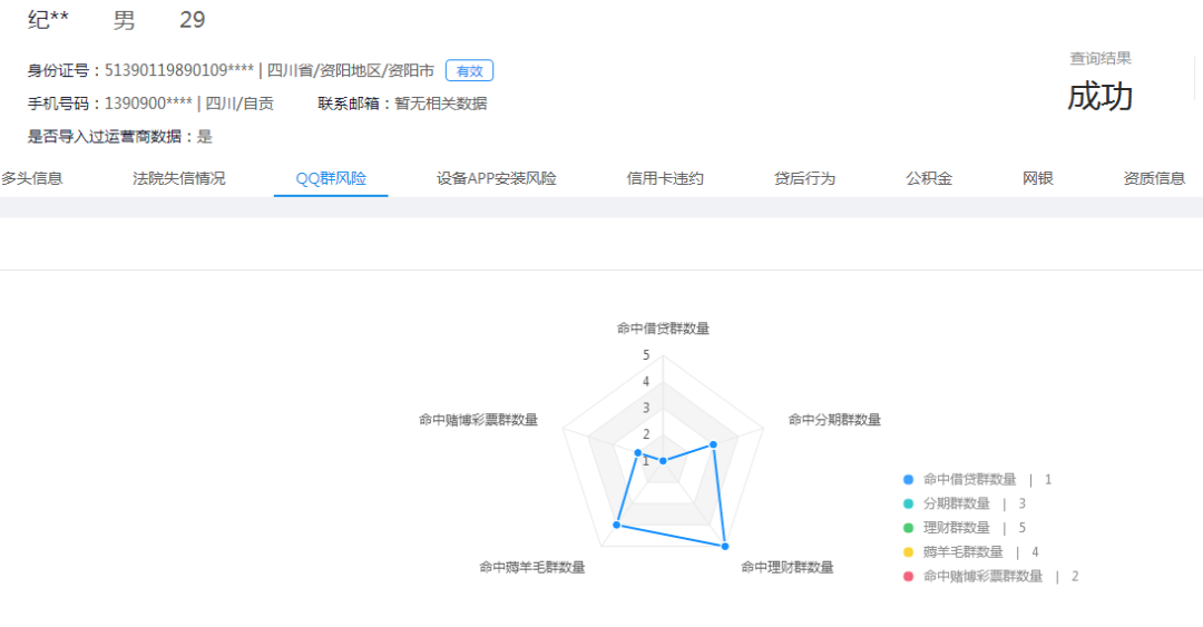 另一份综合性的报告中,则显示了某用户的法院失信情况、QQ群风险、贷后行为、公积金等,内容也非常详细,比如在其QQ中,有多少个借贷群、分期群、理财群等;在贷后行为数据中,有最近7天、15天、1个月、3个月、6个月、1年的各项指标。