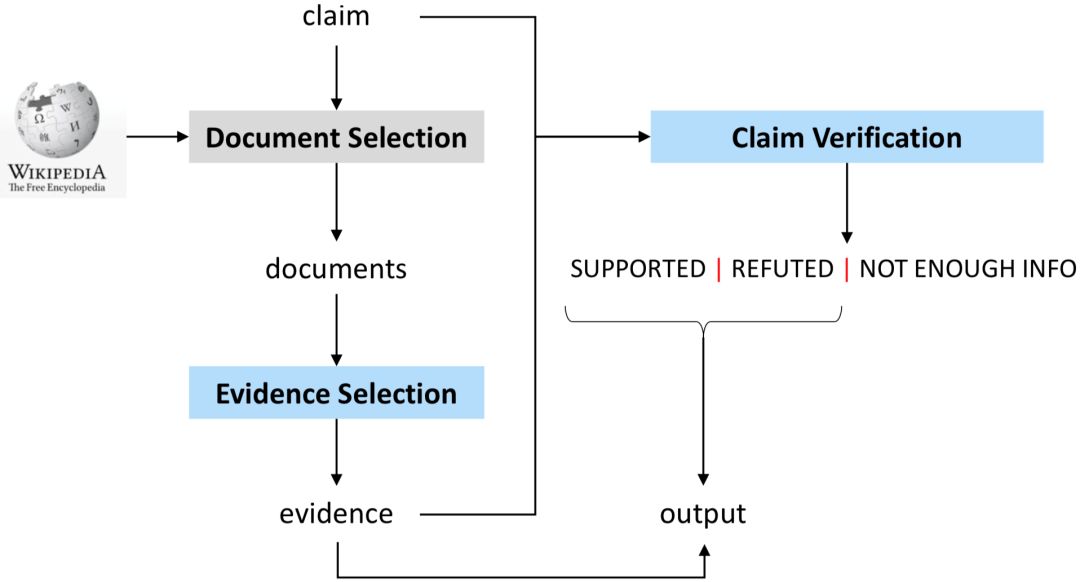我们以 FEVER (Fact Extraction and VERification) [4] 评测为例开展事实检测的研究,该数据是目前规模最大的事实检测公开数据集。该任务定义如下:给定一个自然语言陈述(claim,通常为一句话),要求从 Wikipedia 的文档中寻找多句话作为证据(evidence),利用该 evidence 去判断该陈述的真伪(SUPPORTED/REFUTED)。如果 evidence 的信息不足以支撑判断陈述的真伪,则输出(NOT ENOUGH INFO)。